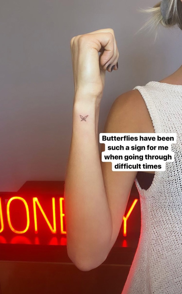 The mom of three shared a picture of her second tattoo which is a small butterfly on her left wrist. Kristin Cavallaris new tattoo is a sign for enduring difficult times. On her Instagram Story she shared a pic of the letters CJS.